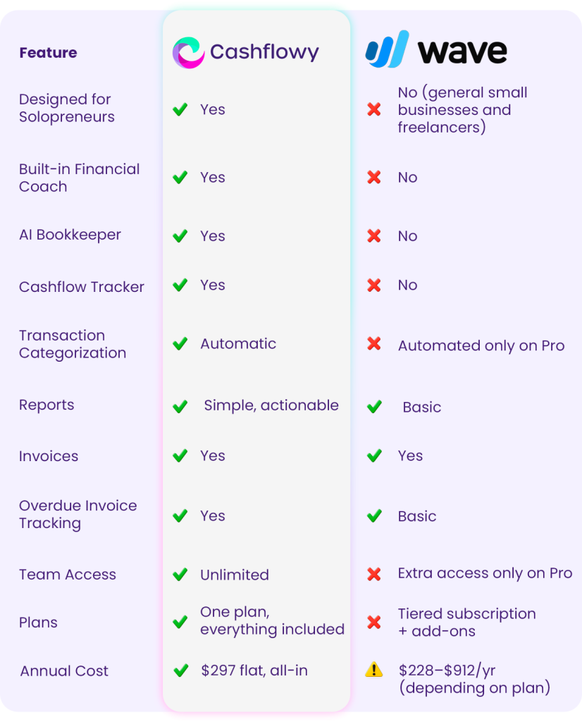 The takeaway: Wave is free but limited. Cashflowy is simple, all-in, and designed for solopreneurs who want to truly understand their money.
